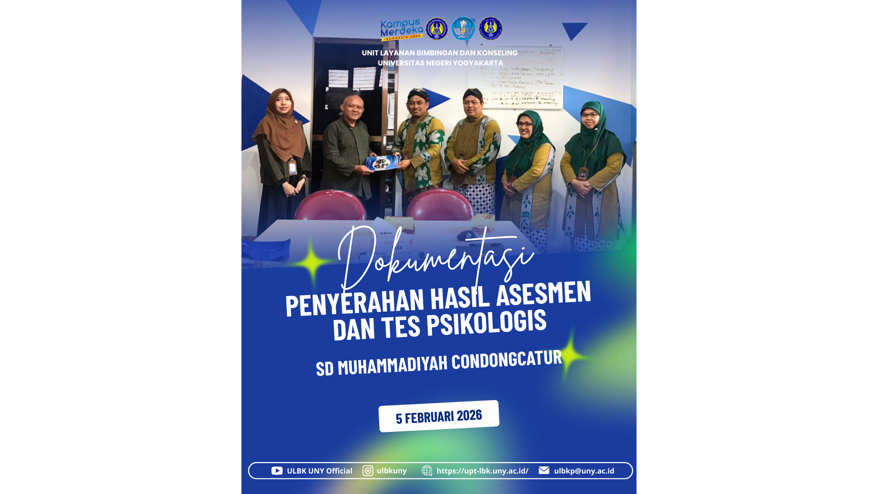 Unit Layanan Bimbingan dan Konseling Universitas Negeri Yogyakarta (ULBK UNY) telah melaksanakan kegiatan penyerahan sekaligus pemaparan hasil asesmen dan layanan tes psikologi bagi peserta didik di SD Muhammadiyah Condongcatur pada Jumat, 06 Februari 2026.
