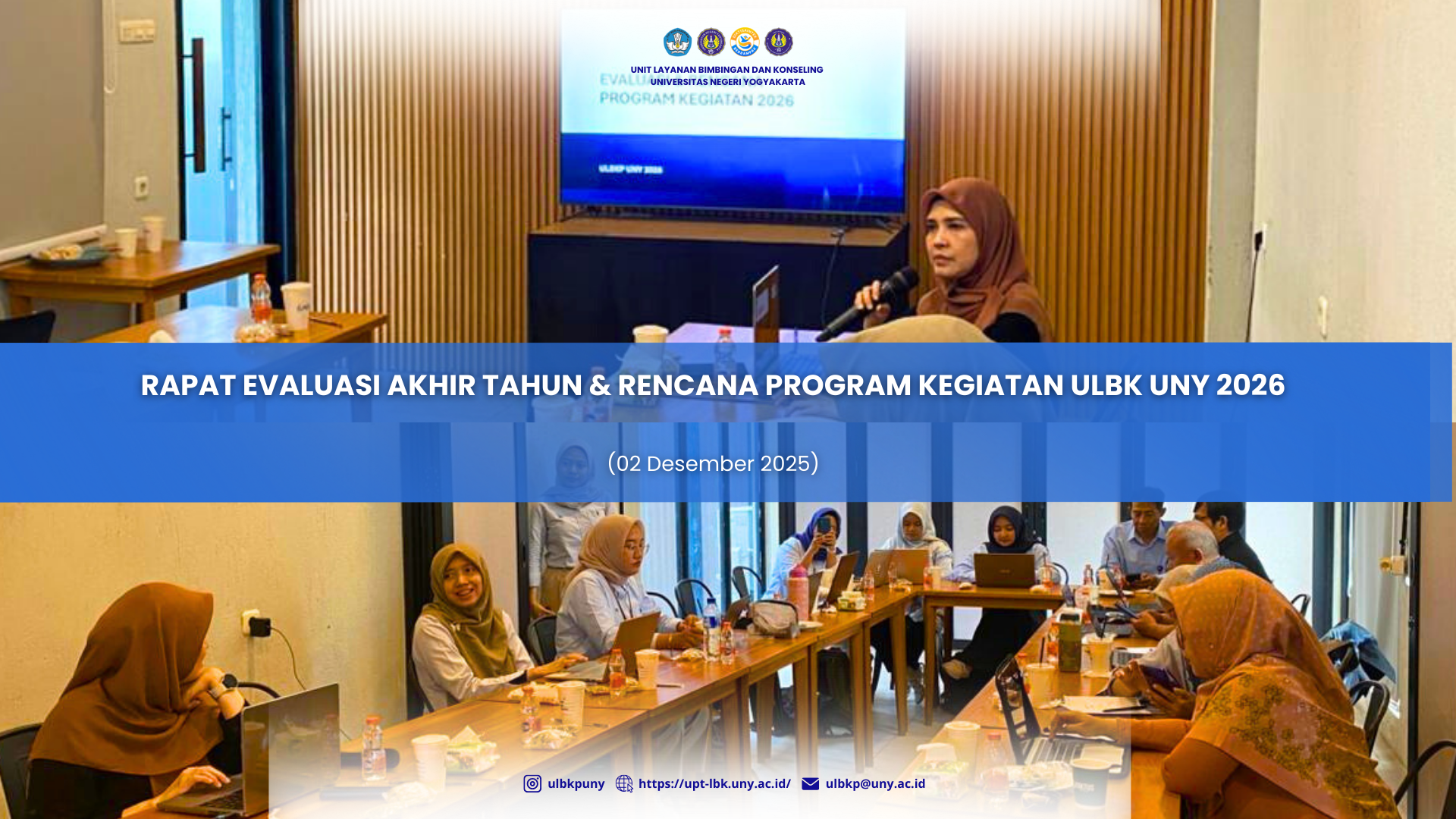 Unit Layanan Bimbingan dan Konseling Universitas Negeri Yogyakarta (ULBK UNY) telah melaksanakan Rapat Evaluasi Akhir Tahun sebagai bagian dari upaya refleksi dan penguatan kinerja kelembagaan. Kegiatan ini bertujuan untuk mengevaluasi pelaksanaan seluruh program dan layanan ULBK UNY selama tahun 2025, sekaligus menyusun arah kebijakan serta program kegiatan untuk tahun 2026.
