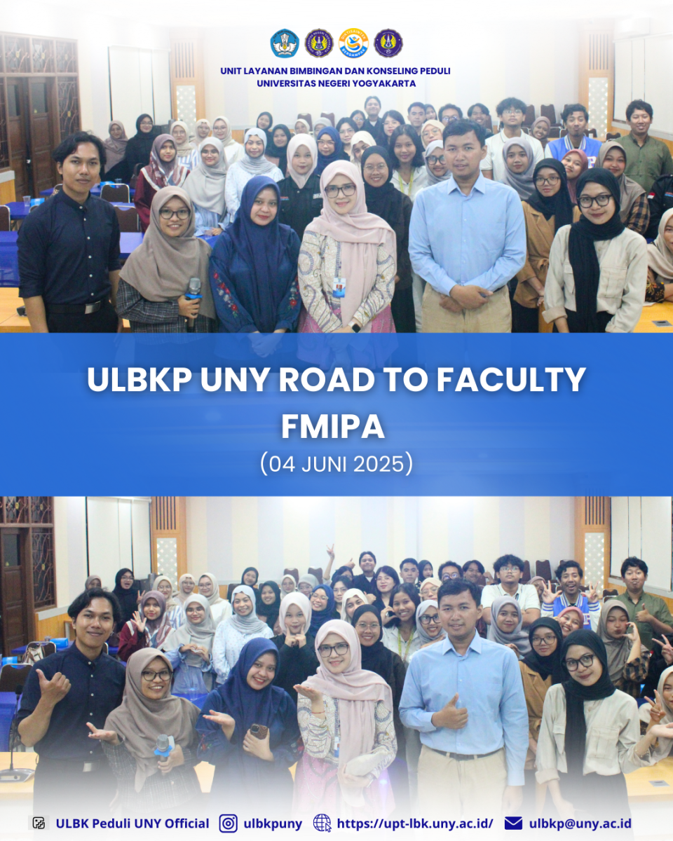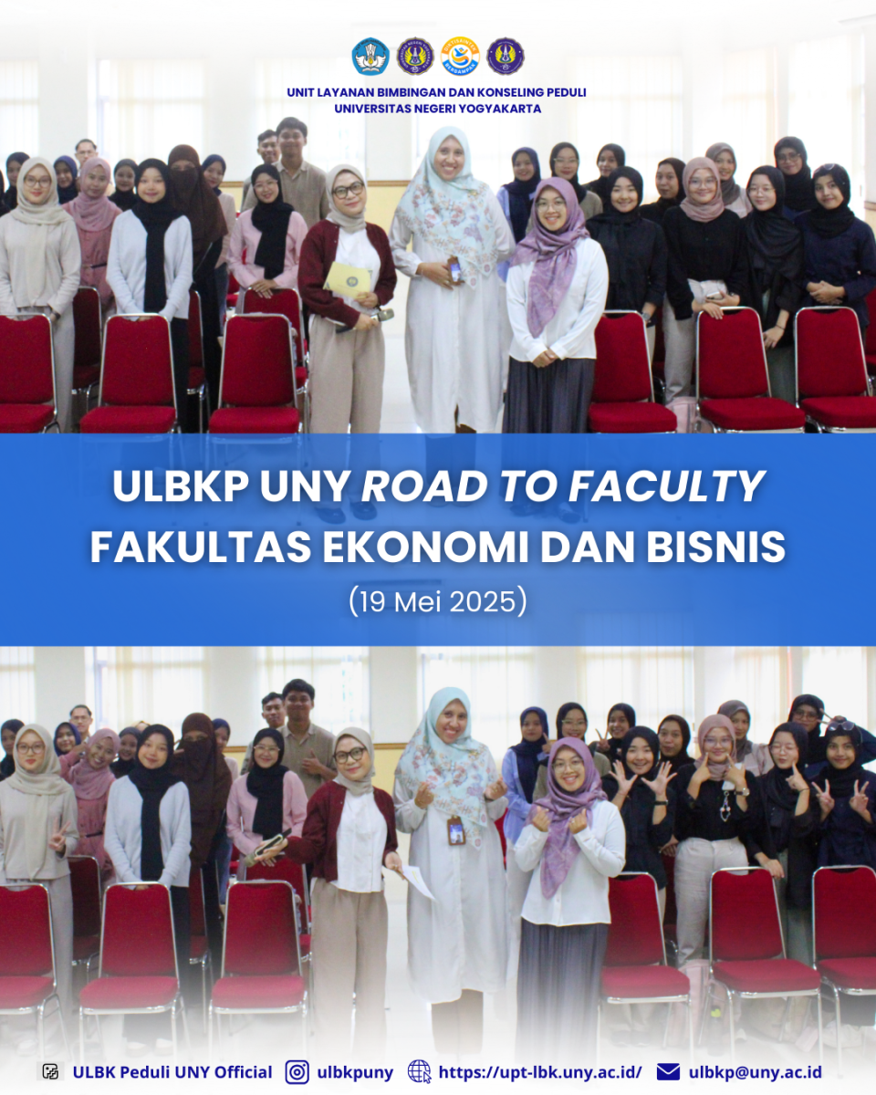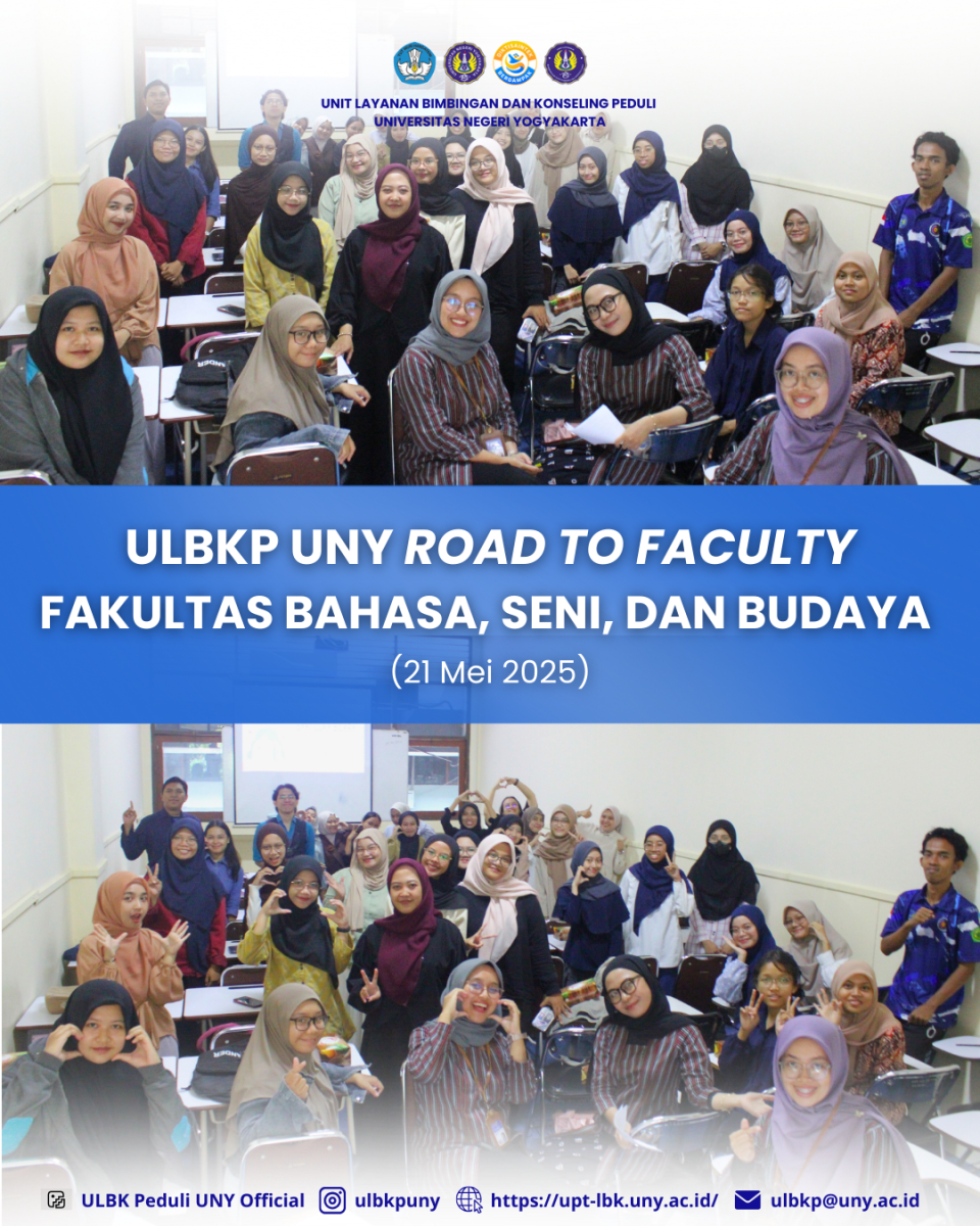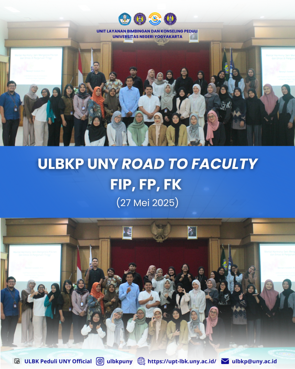 Kampus Unit Layanan Bimbingan dan Konseling Psikologi (ULBKP) Peduli UNY mengadakan kegiatan “ULBKP UNY Road to Faculty” sebagai upaya membangun kesadaran akan pentingnya kesehatan mental di lingkungan kampus. Program ini dilaksanakan secara berkala di setiap fakultas, menghadirkan narasumber profesional, serta dirancang berdasarkan data kebutuhan nyata mahasiswa di masing-masing fakultas. Rangkaian kegiatan yang telah terlaksana adalah sebagai berikut: