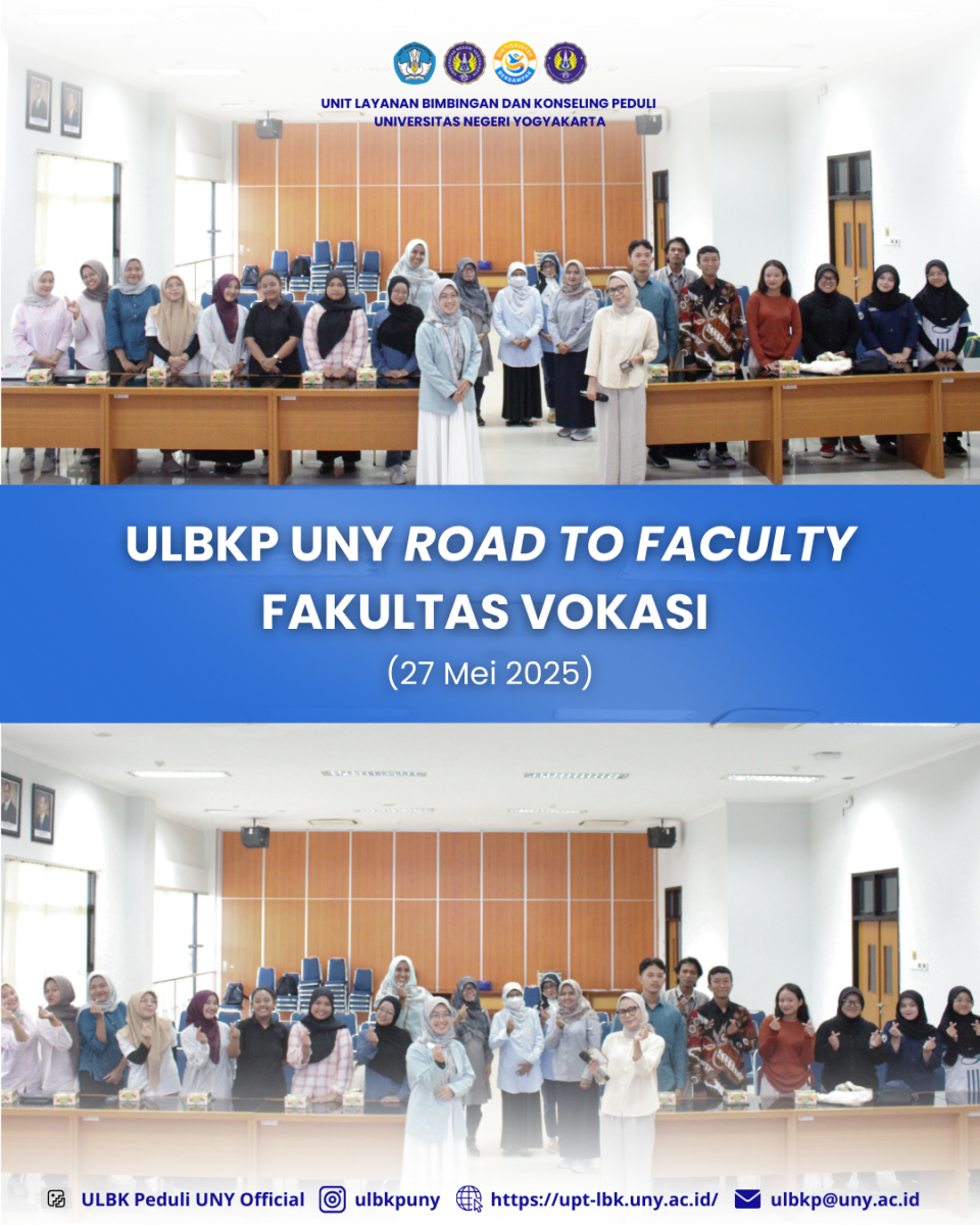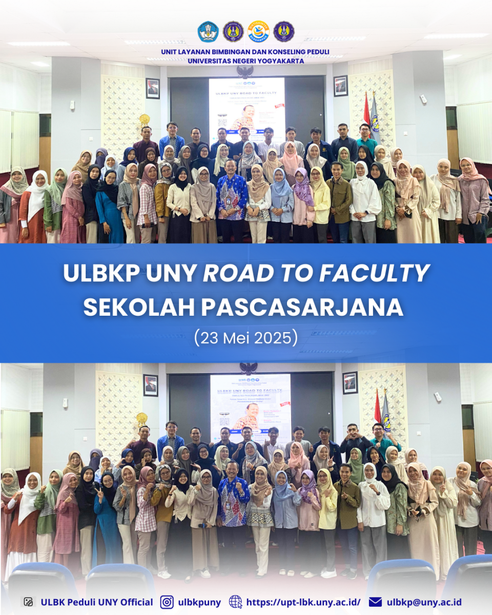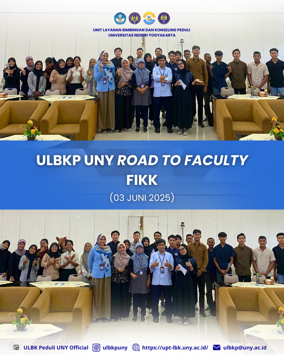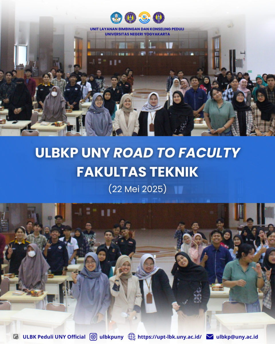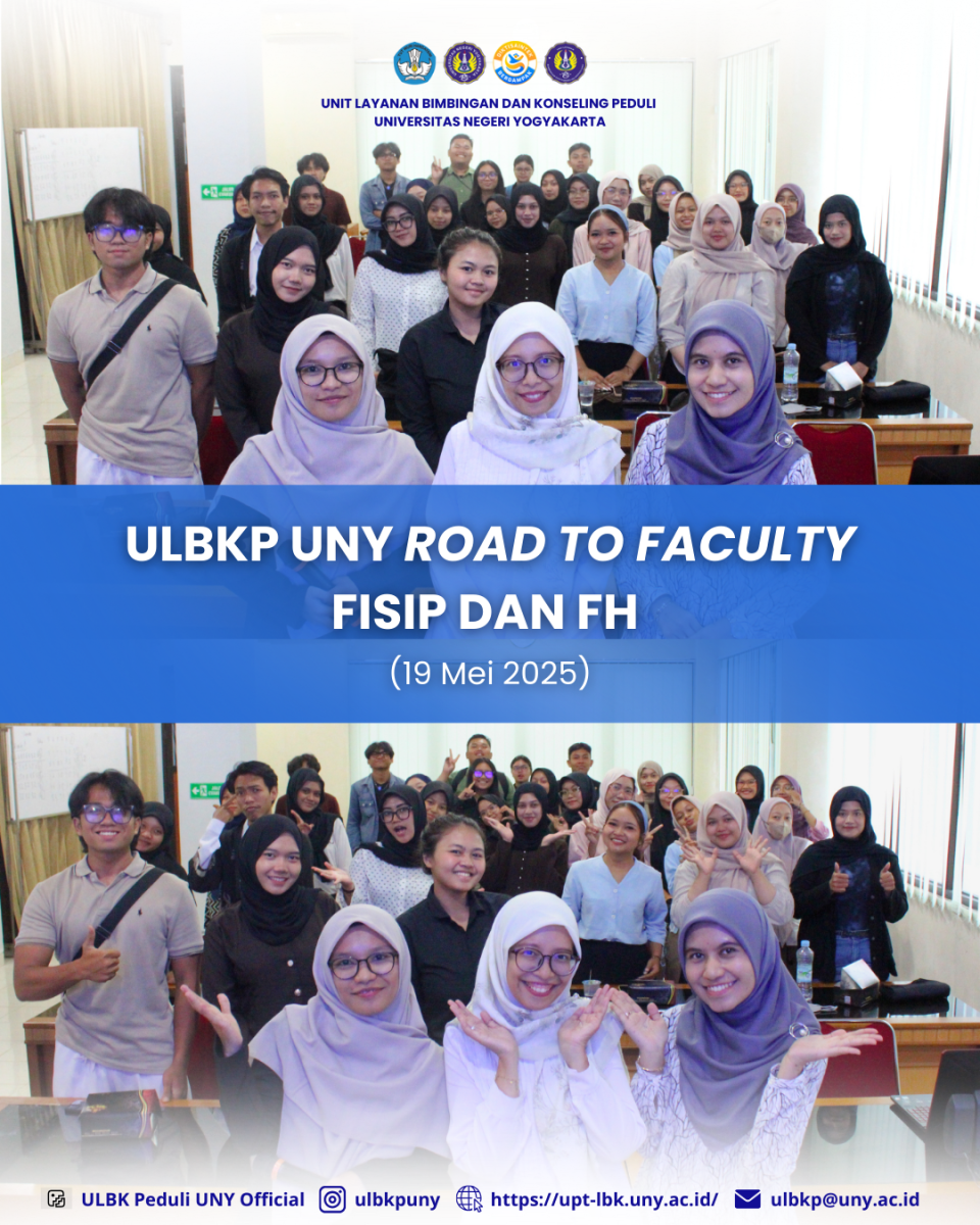 Kampus Unit Layanan Bimbingan dan Konseling Psikologi (ULBKP) Peduli UNY mengadakan kegiatan “ULBKP UNY Road to Faculty” sebagai upaya membangun kesadaran akan pentingnya kesehatan mental di lingkungan kampus. Program ini dilaksanakan secara berkala di setiap fakultas, menghadirkan narasumber profesional, serta dirancang berdasarkan data kebutuhan nyata mahasiswa di masing-masing fakultas. Rangkaian kegiatan yang telah terlaksana adalah sebagai berikut: